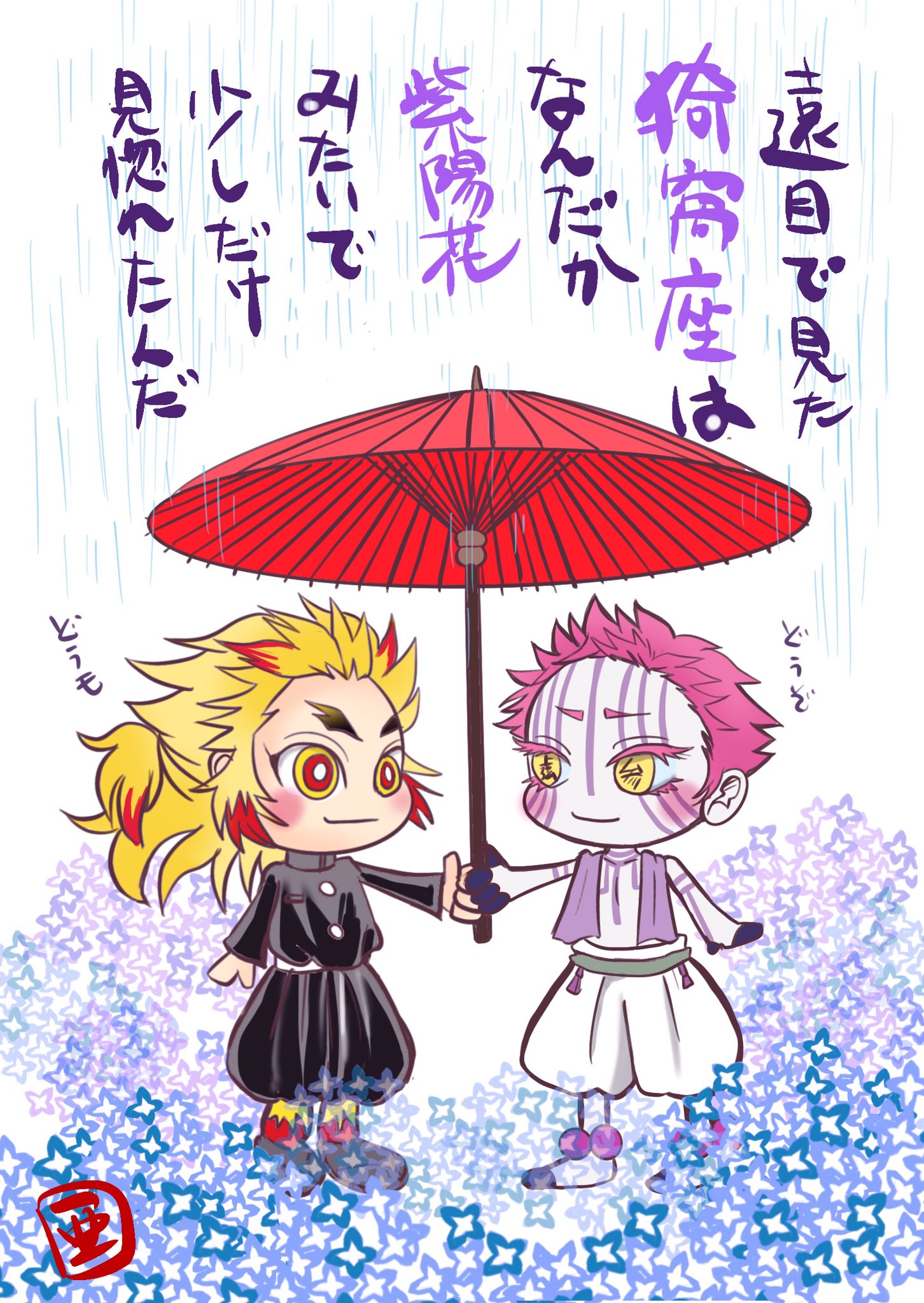 亜乃 素敵なタグをお借りしました ミニキャラ猗窩座は少し紫陽花の妖精っぽいね 珍しいパターンの2人です 梅雨なので猗窩煉強化期間しよう 猗窩煉