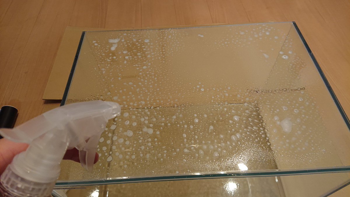 水槽のバックスクリーンの簡単な貼り方は? バックスクリーンは そこまで貼るのは大変ではありません。 裏面にのり部分があるので そこをぺたっとするだけで簡単に貼ることができます。 手作業が苦手な方も中にはいると思いますので では、当社のバックスクリーンの貼り方をご説明します。 当社のバックスクリーンは全てセロハンテープ等で水槽の外側に張り付けるタイプです。 このようにバックスクリーンと水槽を一緒に貼り付けます。 ※写真の水槽はラピレスRV60Nになります。 1,シートを敷いて水槽を置きます 2,スクリーンを貼る水槽の面にガンスプレーで石鹸水を満遍なくかける 3,パテで石鹸水を流す 4,再度石鹸水を満遍なく水槽にたっぷりかける 5,スクリーンのフィルムを剥がす 6,角を合わせてスクリーンの上にも石鹸水をかける 7,中心から放射状にパテを使ってエアーを抜く 8,定規とカッターを使って余分な部分をカットし